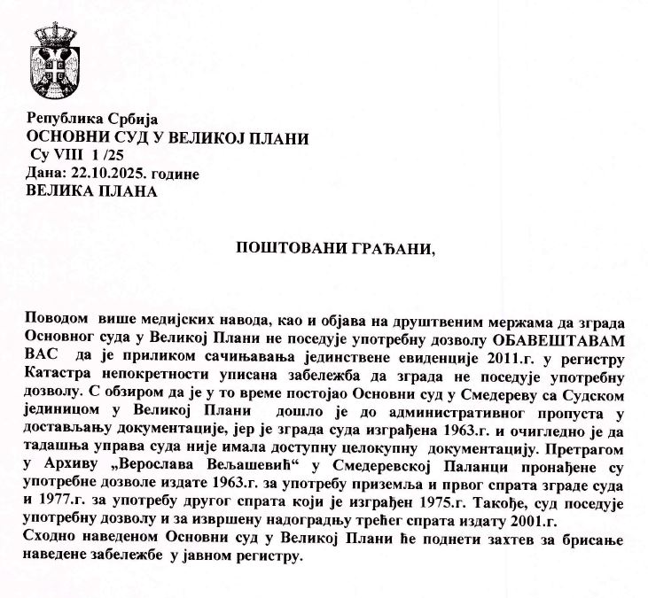 Поводом више медијских навода, као и објава на друштвеним мрежама да зграда Основног суда у Великој Плани не поседује употребну дозволу ОБАВЕШТАВАМ ВАС да је приликом сачињавања јединствене евиденције 2011.г. у регистру Катастра непокретности уписана забележба да зграда не поседује употребну дозволу. С обзиром да је у то време постојао Основни суд у Смедереву са Судском јединицом у Великој Плани дошло је до административног пропуста у достављању документације, јер је зграда суда изграђена 1963.г. и очигледно је да тадашња управа суда није имала доступну целокупну документацију. Претрагом у Архиву „Верослава Вељашевић“ у Смедеревској Паланци пронађене су употребне дозволе издате 1963.г. за употребу приземља и првог спрата зграде суда и 1977.г. за употребу другог спрата који је изграђен 1975.г. Такође, суд поседује употребну дозволу и за извршену надоградњу трећег спрата издату 2001.г.